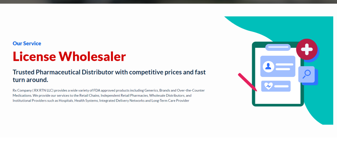 Rx Company ( RX RTN LLC) is a US Based Company which provides a wide variety of FDA approved products including Generics, Brands and Over-the-Counter Medications. They provide thier services to the Retail Chains, Independent Retail Pharmacies, Wholesale Distributors, and Institutional Providers such as Hospitals, Health Systems, Integrated Delivery Networks and Long-Term Care Provider.